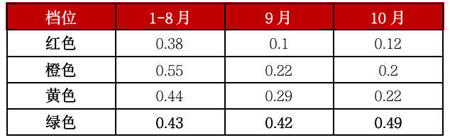绿色档位房企在9、10月份也保持较高拿地积极性,10月单月拿地销售比甚至达到0.49,高于1-8月整体水平。