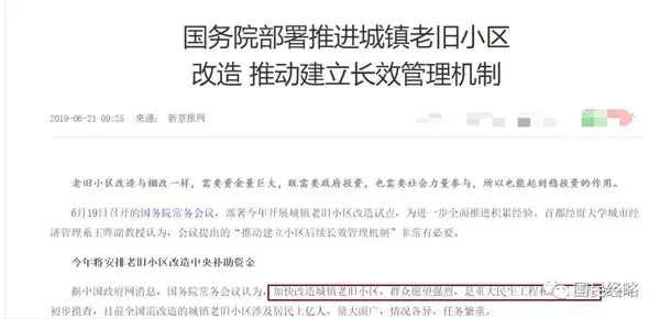 近日,国务院常务会议提出“加快推进城镇老旧小区改造”。文件指出:老旧小区改造涉及居民上亿人,能够促进住户户内改造并带动消费。