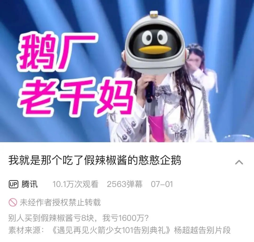 最傻白甜:腾讯和老干妈杠上了“古有窦娥冤,今有逗鹅冤”“国民女神”老干妈和“南山必胜客”腾讯的大瓜,想必大家也一定没少吃。假老干妈找腾讯打广告,腾讯状告老干妈拖欠千万广告费;后来腾讯发现被骗后被群嘲,将错就错延展出全新的剧情,成功打造一次反客为主的案例。腾讯先是在微博自嘲“辣椒酱不香了”,后又自掏腰包入手1000瓶悬赏千瓶老干妈求骗子线索,更是在B站发布《我就是那个吃了假辣椒酱的憨憨企鹅》视频。