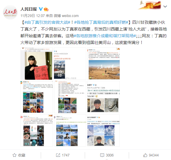 这时“国家队”火速出手,四川甘孜理塘县国资委下属的理塘县文旅体投资发展有限公司与丁真签约,让丁真担任理塘县旅游形象大使。紧接着,开通“理塘丁真”微博,拍宣传片《丁真的世界》,丁真关注度水涨船高,激发大众对高原风光的向往。当红顶流丁真也因此掀起一场“现象级”的旅游营销,四川借势、西藏插足,多个话题霸占微博热搜:有人错付、有人被“抓”去读书,有人抢旅游代言人,形成了“丁真现象”。比如,四川文旅官微推出话题#其实丁真在四川#话题,晒起了四川山川风景,各大地方官微开始邀请丁真去做客,随着丁真效应的发酵,丁真事件还成为2020年十大旅游事件。