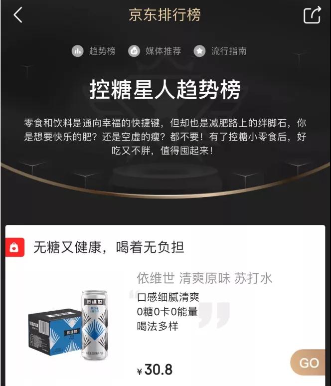 新品的规格为330ml/罐,零售价约为3元+。目前,这款依维世苏打水已经登陆京东、天猫的百事旗舰店以及天猫超市,产品一经上线就受到了广大年轻消费者的青睐。凭借“0糖0卡”的特色,依维世苏打水契合了控糖大趋势,因此还入选了京东平台“控糖星人趋势榜”。