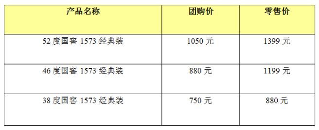 38度国窖1573经典装团购价建议750元/瓶,零售价建议999元/瓶。