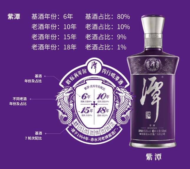 潭酒将几款主推产品——银酱、金酱、红潭、红得发紫、紫潭、紫气东来和年份潭酒系列,打包成了“6+1潭酒真年份家族”。6指银酱、金酱、红潭、红得发紫、紫潭、紫气东来,这几款产品是用多个年份酒调出来的调和年份酒;1指年份潭酒系列,是用同一年份1~7轮次的酒调出来的青瓷瓶单一年份酒。