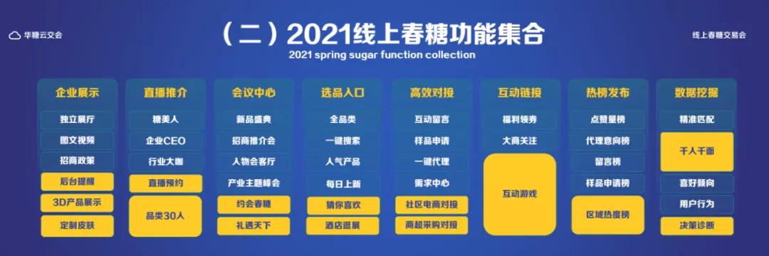 2021年,疫情防控常态化依旧,华糖云商洞察行业需求与商业痛点,与行业人士同步,紧紧把握线上春糖的确定性,努力打赢线上春糖的战役,倾华糖之力在行业转型阶段搭建B2B传播推广线上平台、B2B交易撮合智慧程序。