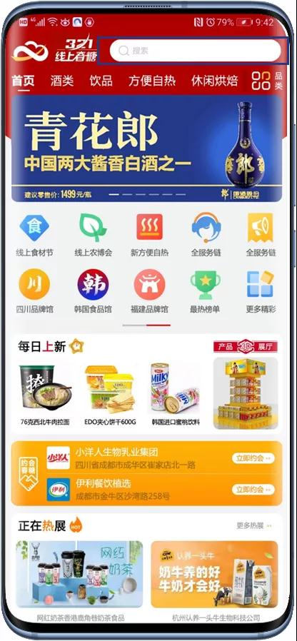 茅台、五浪液、洋河、剑南春、泸州老窖、郎酒、江小白等知名酒企,旺旺、伊利、统一、达利、六个核桃、名仁等食品品牌,老干妈、益海嘉里、思念、新希望、正大、王致和等调味品、食材企业悉数参展。主流企业、海量产品,只需在搜索栏“一键搜索”,即可找到您心仪的产品。