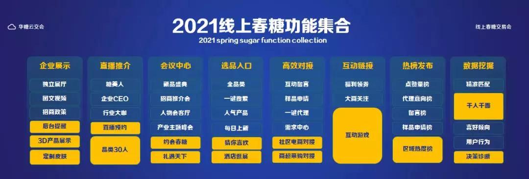 2021线上春糖打破人货场物理界限,汇集全球渠道商与品牌商,打造全渠道推广招商掌上平台,整合华糖资源,赋能线上春糖,权威、高效、简单、专业,大大提升信息共享效率,降低企业推广难度及成本,是性价比高的招商推广新选择,超强流量,打造产品和品牌的超级推广。