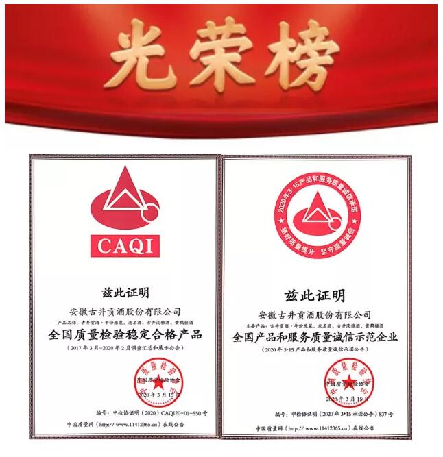2020年4月,在由国家市场监管总局、中国质量检验协会主办的2020年“3·15” “产品和服务质量诚信承诺”主题活动中,古井贡酒再次荣获“全国产品和服务质量诚信示范企业”和“全国质量检验稳定合格产品”两项荣誉。至此,古井贡酒已连续五年获评以上殊荣。