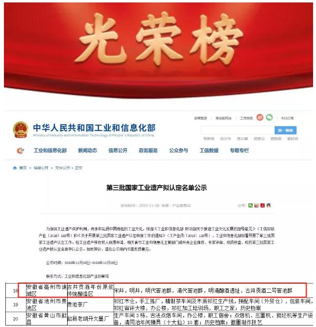 2019年11月,国家工信部正式核定并公布了第三批国家工业遗产名单,古井贡酒年份原浆传统酿造区成功入选。
