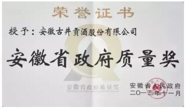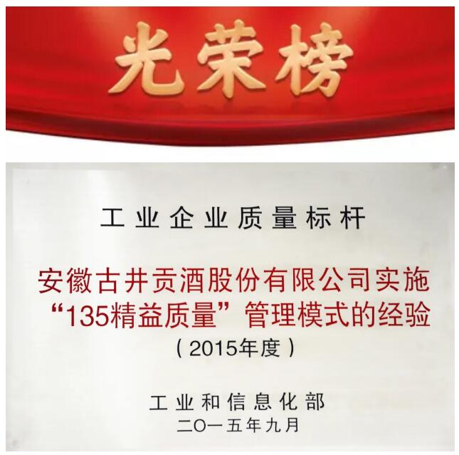 2015年,古井贡酒荣获国家工业和信息化部颁发的“全国工业企业质量标杆”奖,这是继“安徽省政府质量奖”之后获得的又一殊荣,安徽省本土企业仅此一家,也是白酒业质量管理方向一家获奖企业。