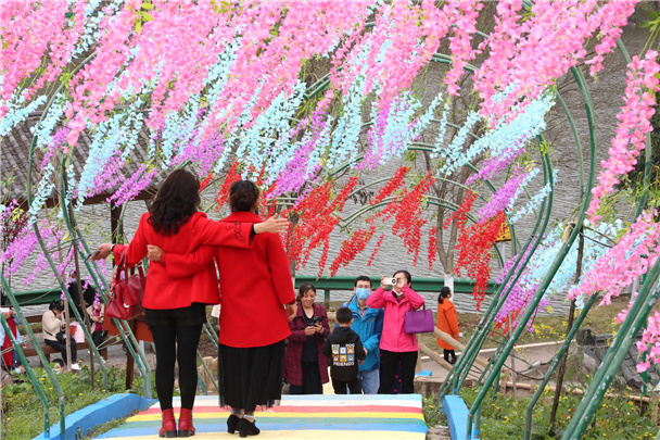 花艺长廊处,彩虹阶梯一路延伸至山顶,心形铁艺上五彩缤纷的紫藤花,迎风起舞,成了游人的挚爱。大家纷纷拾阶而上,一路赏景一路留影,不负这如画春烟。