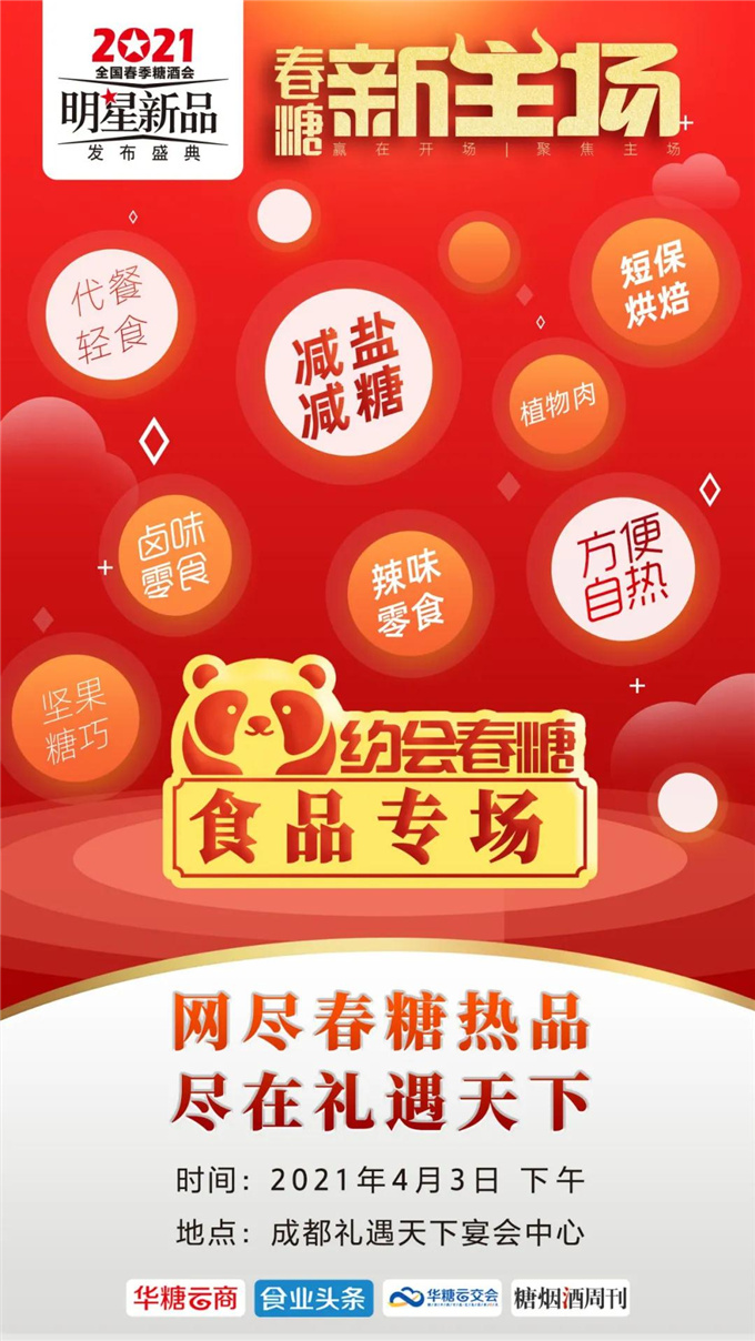 02活动名称:2021全国春季糖酒会明星新品发布盛典——食品专场发布会(品质鲜香 品味未来——2021品品鲜香技术标准发布会)活动时间:2021年4月3日下午活动地点:成都礼遇天下宴会中心一号厅活动亮点:集中发布2021年食品行业潜力新品,对接品牌资源;汇聚1000+食品大商,实现厂商对接;聚焦行业热门话题,权威大咖预判品类风口;解读企业合作政策,搭建高质量的服务平台。
