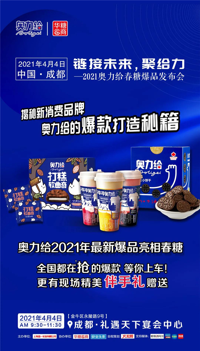 03活动名称: 链接未来,聚给力——2021奥力给春糖爆品发布会活动时间:2021年4月4日上午活动地点:成都礼遇天下宴会中心一号厅活动亮点:2020年,一款名为“奥力给”的可可小饼干在胖东来一夜爆红、上市不到半年创造了七千万的销售业绩……本次发布会,新消费品牌奥力给从品牌、渠道、营销等方面,解读爆款的打造秘籍。奥力给携小饼干、高纤果奶、打糕软曲奇等爆品亮相春糖,与经销商朋友共享时代红利。