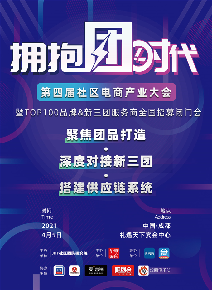 05活动名称:拥抱团时代——第四届社区电商产业大会暨TOP100品牌&新三团服务商全国招募闭门会活动时间:2021年4月5日全天活动地点:成都礼遇天下宴会中心一号厅(上午)/宴会中心五号厅(下午)活动亮点:汇集新三团、老三团、品牌及服务商等资源,聚焦社区团购行业火热团品话题,布局社区新零售,关注供应链系统建设,搭建更健全的服务平台。