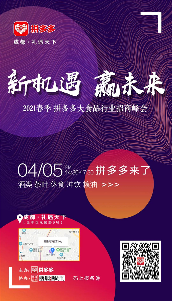 06活动名称:新机遇 赢未来——2021春季拼多多大食品行业招商峰会活动时间:2021年4月5日下午活动地点:成都礼遇天下宴会中心一号厅活动亮点:4月5号,拼多多携7.884亿活跃用户,亮相全国糖酒会。其将在成都礼遇天下举办“新机遇 赢未来 2021春季拼多多大食品行业招商峰会”,热烈欢迎酒类、茶叶、休食、冲饮、粮油等行业的商家朋友参会。