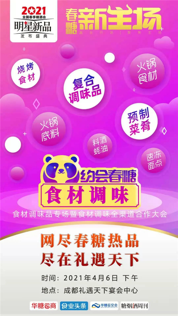 08活动名称:2021全国春季糖酒会明星新品发布盛典——食材调味品专场发布会暨食材调味全渠道合作大会(品质时代 低温领鲜——王家渡低温爆品发布会)活动时间:2021年4月6日下午活动地点:成都礼遇天下宴会中心一号厅活动亮点:集中发布2021年度引领食材调味产业趋势的明星新品,深度解读食材调味品产业前沿话题,定向邀请1000+食材调味品全渠道经销商选品对接,打造权威新品发布平台和厂商对接平台。
