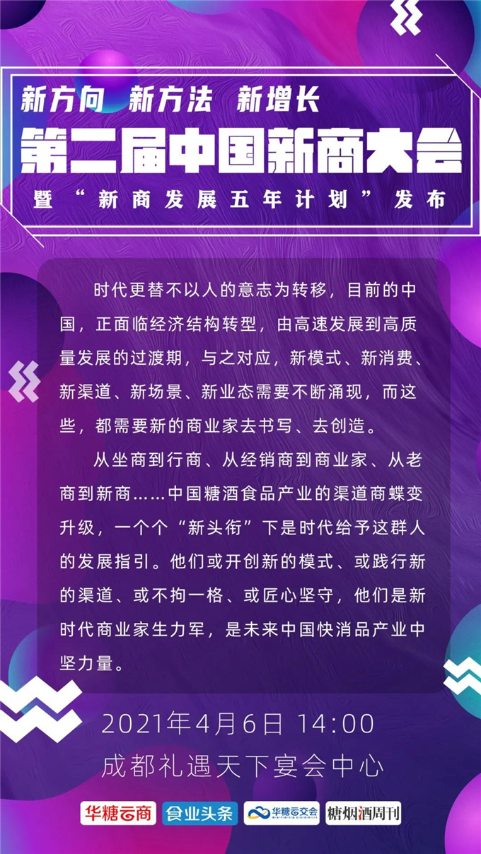 09活动名称:新方向 新方法 新增长——第二届新商大会暨“新商发展五年计划”发布会活动时间:2021年4月6日下午活动地点:成都礼遇天下宴会中心五号厅活动亮点:读新商,剖析渠道变革;做新商,讲述崛起路径;看新商,拥抱产业升级;赢新商,共创行业未来。汇聚主流新商,共建新商业竞争力。