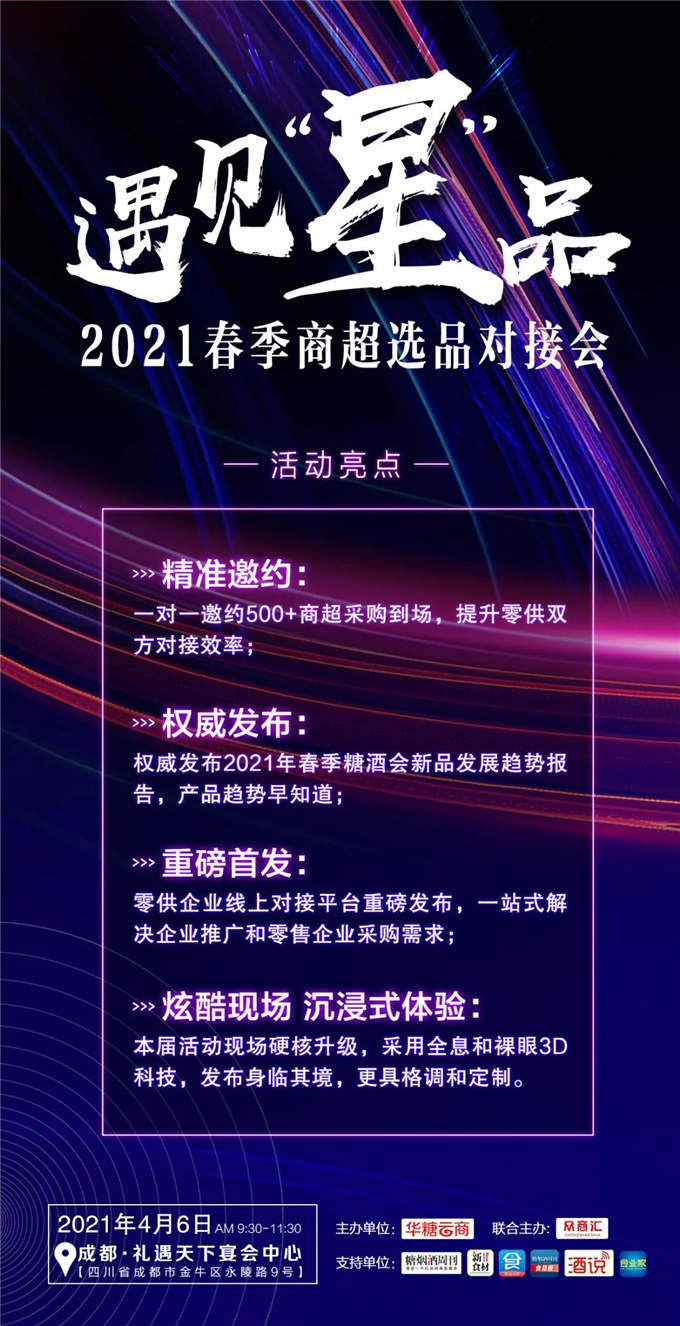 10活动名称:遇见“星”品——2021春季商超选品对接会活动时间:2021年4月6日上午活动地点:成都礼遇天下宴会中心五号厅活动亮点:一对一邀约500+商超采购到场,零供企业对接,权威发布2021年春季糖酒会新品发展趋势报告,零供企业线上对接平台隆重发售,提升生产企业推广和零售企业选品效率。