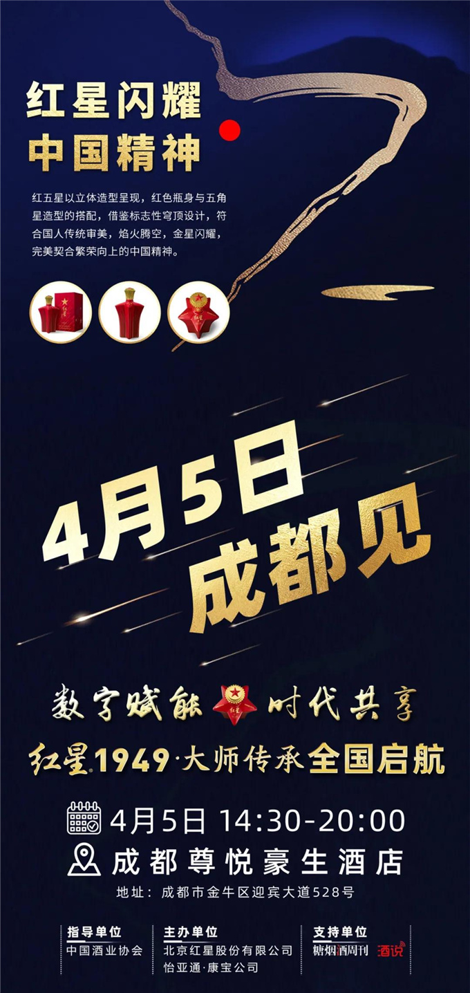 2021年4月5日下午,春季糖酒会期间,“数字赋能 时代共享——红星1949·大师传承全国启航”大会将隆重召开。届时,红星1949·大师传承将发布全国化战略,闪耀北京的红星1949·大师传承全国旅程即将启航。