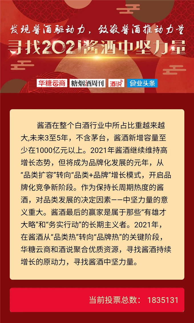 酱酒从“品类扩容”转向“品类+品牌”增长模式,正在迎来品牌化竞争的新阶段。因此,面对酱酒从“品类热”转向“品牌热”的关键阶段,华糖云商和酒说聚合资源,寻找酱酒持续增长的原动力,寻找酱酒中坚力量。在火爆的183余万人次投票背后,“寻找2021酱酒中坚力量”有三大亮点值得特别关注: