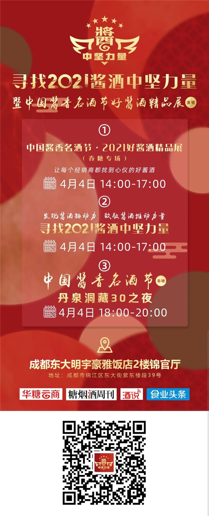 酱酒中坚力量,其核心推动力是什么?分别为酱酒发展和白酒行业带来怎样的品牌贡献和价值引领?春糖期间,4月4日14:00-17:00,由华糖云商联合酒说、《糖烟酒周刊》、食业头条共同发起并举办的“寻找2021中国酱酒中坚力量”活动将在成都东大明宇豪雅饭店隆重举行。在这里,为你找到答案!