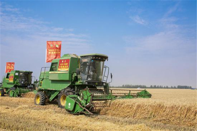 “开收啦!”随着一声响亮的号令,数十台大型联合收割机一齐发动——位于安徽农垦集团龙亢农场的古井贡酒年份原浆5万亩专用小麦正式开始收割。