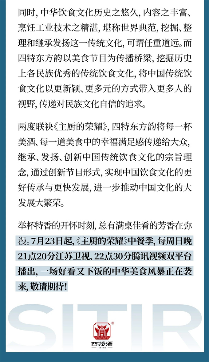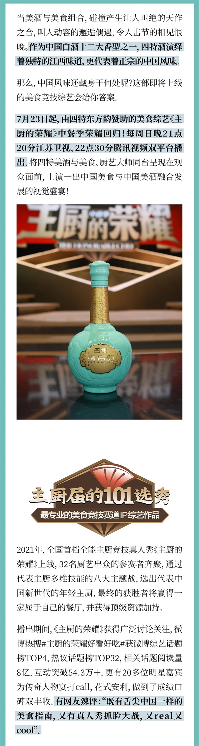 即将开播!四特东方韵携手《主厨的荣耀》诠释正宗“中国风味”!