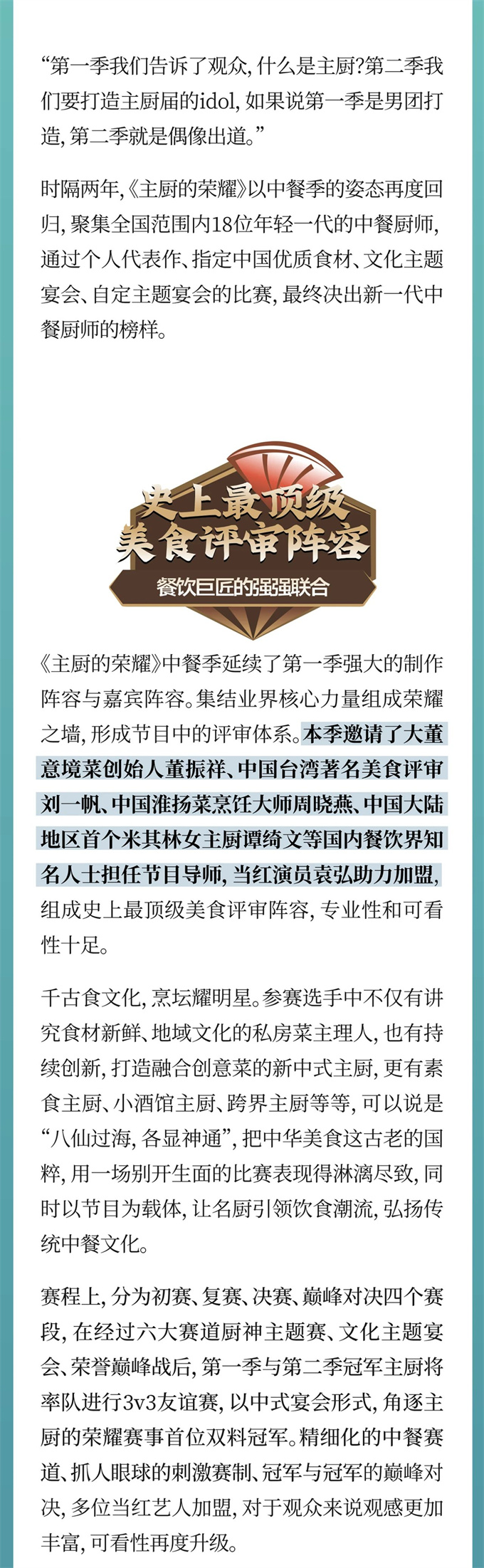 7月23日起,由四特东方韵赞助的美食综艺《主厨的荣耀》中餐季荣耀回归!