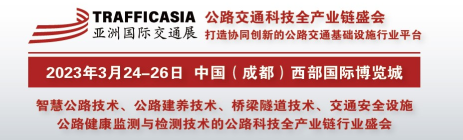 作为新时代公路交通科技产业最重要的展会之一,Trafficasia 2023亚洲国际交通技术与工程设施展览会(以下简称Trafficasia亚洲交通展)将为公路交通基础设施建设领域提供领先的前瞻资讯、技术交流、市场解决方案和投资机会。Trafficasia亚洲交通展将于2023年3月24-26日在中国(成都)西部国际博览城盛大举行,面向全球企业集中展示公路交通基础设施建设的新趋势、新技术、新研发、新应用。本届展会以“新技术、新动能、新格局”为主题,展览面积45000平方米,约400家高质量参展商,专业观众预计30000人次。展会致力于全面展示路·桥·隧交通基础设施领域的创新解决方案,涵盖交通成果展示、智慧公路技术、公路建养技术、桥梁隧道技术、交通安全设施、公路健康监测与检测等各个环节,为促进行业合作共融、整合升级、提升服务价值链搭建展示交流的行业平台。展会还将同期举办2023中国公路科技创新大会,将邀请来自交通运输部、中国工程院、交通运输部规划院、交通运输部公路院、西南交通大学、重庆交通大学、同济大学、蜀道集团等科研院所及行业领先技术企业的百余名业内顶级专家一同全程参与这场千人大会,致力于打造一个政、产、学、研一站式公路交通技术交流平台。Trafficasia亚洲交通展定将会成为您树立品牌形象、结交商务合作伙伴、寻求终端客户的最佳平台!更将为您提供一个难得的培训机会,让您洞察先机,把握现在,掌控未来!▼ 行业龙头抢滩进驻,展示全球顶尖公路交通解决方案;▼ 专题专区专展,展品垂直细分,覆盖公路基础设施全产业链;▼ 45,000平方米面积,400+参展商,30000+专业观众;▼ Trafficasia全球优质买家数据库,助你拓展海内外市场;▼ 200+海内外媒体保驾护航,买家数量&高品质保证;◆ 路桥隧重大工程建设成果;科研院所创新成果;设计规划勘察单位、建设施工单位的优秀成果等。◆ 智慧公路解决方案、智慧基础设施、运行监测系统、信息服务系统、智慧路产管理系统、智慧交通管控系统、智慧交通安全设施、应急处置系统、公路管养系统、智慧辅助决策系统;公路路网数字化、感知设备、智能化设施、运行状态监控、视频监控、路面病害监测、气象监测及预警、重点营运车辆安全管控、车道级主动管控、可变标志控制、行车安全诱导、超限车辆管控、交通行政执法,智能消冰除雪、应急指挥调度、伴随式信息服务、智慧服务区、智慧照明、云控中心、车路协同等技术与解决方案;◆ 高速公路、国省干线、城镇道路等新技术、新材料、新工艺、新设备;道路建养技术;道路建养机械与装备;沥青材料;智能养护管理系统;道路建养材料;路基建设/维修设备;路容路貌养护设备;道路检测设备;基础设施管理系统;公路规划和设计系统等。◆ 桥隧建养技术;建养机械装备;桥梁施工设施;桥梁安全防护设备;桥梁构件与附属设施;桥梁维修、桥梁改造加固设备;桥梁材料与设施;桥梁抗震缓冲装置;隧道施工机械及配套设备;盾构及配套;非开挖设备及配套;隧道建筑及特种材料;照明与供电技术与产品;通风设备;通信技术与设备;地下消防设备;桥隧智慧监测系统;BIM及设计类软件;规划设计;建筑设计软件;咨询机构等。◆ 桥梁、隧道、边坡结构安全监测预警系统;监测传感设备;数据采集设备;数据传输设备;智能管理系统等;◆ 路桥隧智能检测设备;道路综合检测车;多功能测试仪;无损检测技术设备;路面摩擦系数车;激光道路平整度测试仪;路面层间试验仪;地质超前预报系统;锚杆质量检测仪;远距离裂缝观测仪;动态应变采集设备;激光隧道断面检测仪;主体结构及病害检测设备;环境检测设备;预应力检测仪;回弹仪;地质雷达;爆破振动仪;红外探水仪;裂缝检测仪、裂缝测宽仪;非金属超声波仪;桥梁挠度检测仪;钢筋保护层测定仪;灌浆密实度测检测仪;便携式智能检测仪;道路标线逆反射系数检测仪;标线测厚仪;突起路标测量仪;建设材料试验及检测设备、试验室检测设备、材料检测和测试仪器等;◆ 公路护栏、市政护栏、河道护栏、桥梁护栏、护栏配件;交通标志;视线诱导设施、防撞诱导系统;声屏障、隔离栅、防抛网;防眩设施、防眩板;减速带;防撞垫、交通锥、安全路障;交通安全服;反光材料;路面划线机械、道路标线清除设备;升降路桩;车位锁;标线涂料助剂、标线涂料、道路反光玻璃微珠、树脂、PE蜡;环氧地坪;施工设备;交通信号灯;生产制造装备;原材料、新材料;应急设备等交通安全产品。