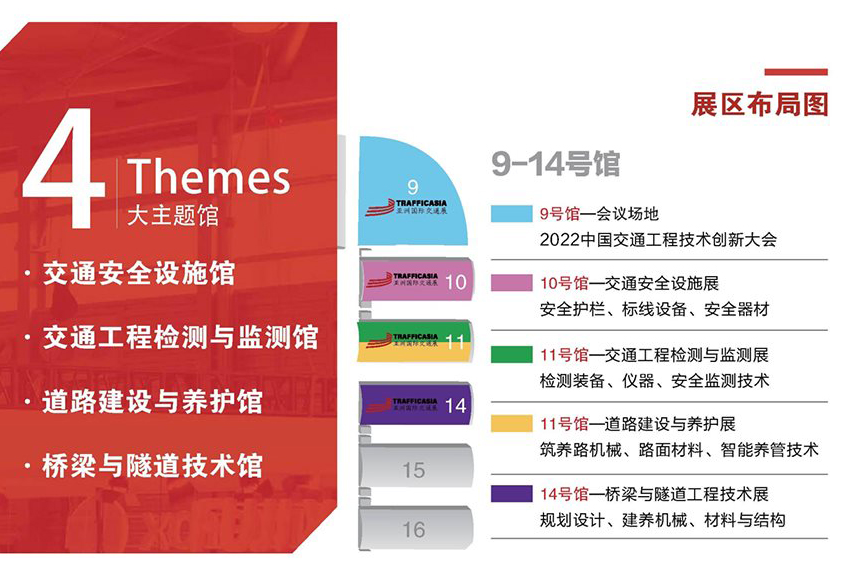 ▼ 行业龙头抢滩进驻,展示全球顶尖公路交通解决方案;▼ 专题专区专展,展品垂直细分,覆盖公路基础设施全产业链;▼ 45,000平方米面积,400+参展商,30000+专业观众;▼ Trafficasia全球优质买家数据库,助你拓展海内外市场;▼ 200+海内外媒体保驾护航,买家数量&高品质保证;◆ 路桥隧重大工程建设成果;科研院所创新成果;设计规划勘察单位、建设施工单位的优秀成果等。◆ 智慧公路解决方案、智慧基础设施、运行监测系统、信息服务系统、智慧路产管理系统、智慧交通管控系统、智慧交通安全设施、应急处置系统、公路管养系统、智慧辅助决策系统;公路路网数字化、感知设备、智能化设施、运行状态监控、视频监控、路面病害监测、气象监测及预警、重点营运车辆安全管控、车道级主动管控、可变标志控制、行车安全诱导、超限车辆管控、交通行政执法,智能消冰除雪、应急指挥调度、伴随式信息服务、智慧服务区、智慧照明、云控中心、车路协同等技术与解决方案;◆ 高速公路、国省干线、城镇道路等新技术、新材料、新工艺、新设备;道路建养技术;道路建养机械与装备;沥青材料;智能养护管理系统;道路建养材料;路基建设/维修设备;路容路貌养护设备;道路检测设备;基础设施管理系统;公路规划和设计系统等。◆ 桥隧建养技术;建养机械装备;桥梁施工设施;桥梁安全防护设备;桥梁构件与附属设施;桥梁维修、桥梁改造加固设备;桥梁材料与设施;桥梁抗震缓冲装置;隧道施工机械及配套设备;盾构及配套;非开挖设备及配套;隧道建筑及特种材料;照明与供电技术与产品;通风设备;通信技术与设备;地下消防设备;桥隧智慧监测系统;BIM及设计类软件;规划设计;建筑设计软件;咨询机构等。◆ 桥梁、隧道、边坡结构安全监测预警系统;监测传感设备;数据采集设备;数据传输设备;智能管理系统等;◆ 路桥隧智能检测设备;道路综合检测车;多功能测试仪;无损检测技术设备;路面摩擦系数车;激光道路平整度测试仪;路面层间试验仪;地质超前预报系统;锚杆质量检测仪;远距离裂缝观测仪;动态应变采集设备;激光隧道断面检测仪;主体结构及病害检测设备;环境检测设备;预应力检测仪;回弹仪;地质雷达;爆破振动仪;红外探水仪;裂缝检测仪、裂缝测宽仪;非金属超声波仪;桥梁挠度检测仪;钢筋保护层测定仪;灌浆密实度测检测仪;便携式智能检测仪;道路标线逆反射系数检测仪;标线测厚仪;突起路标测量仪;建设材料试验及检测设备、试验室检测设备、材料检测和测试仪器等;◆ 公路护栏、市政护栏、河道护栏、桥梁护栏、护栏配件;交通标志;视线诱导设施、防撞诱导系统;声屏障、隔离栅、防抛网;防眩设施、防眩板;减速带;防撞垫、交通锥、安全路障;交通安全服;反光材料;路面划线机械、道路标线清除设备;升降路桩;车位锁;标线涂料助剂、标线涂料、道路反光玻璃微珠、树脂、PE蜡;环氧地坪;施工设备;交通信号灯;生产制造装备;原材料、新材料;应急设备等交通安全产品。
