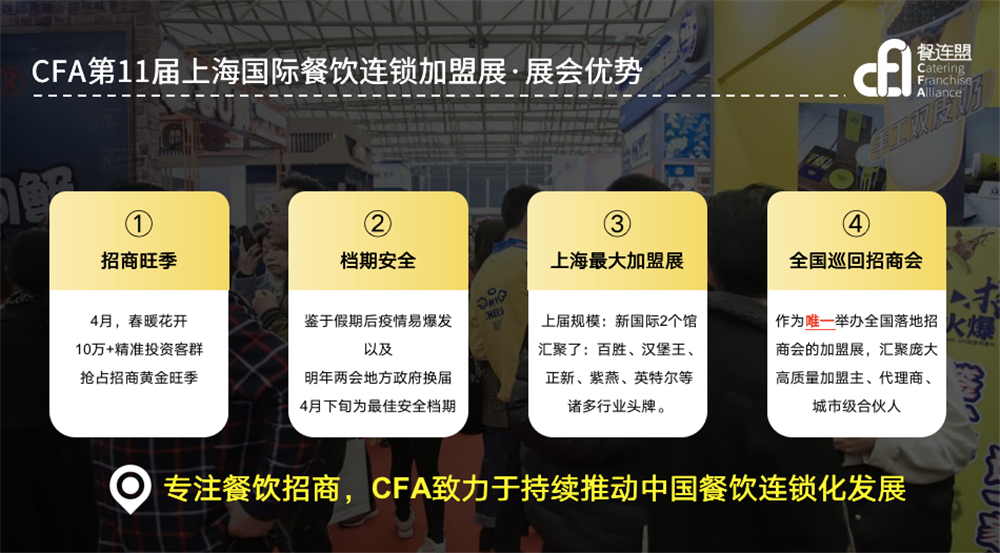 CFA餐连盟·上海国际餐饮连锁加盟展(原CHINA FOOD),上海最大加盟展、中国餐饮投资加盟首选平台,专注餐饮、精准招商,立足上海、 面向全国。作为中国餐饮风向标、中国餐饮领域极具影响力的行业盛会,“CFA餐连盟”聚焦餐饮各赛道众多头部品牌、知名品牌、热门品牌及广 大餐饮投资人的热切目光,无疑成为各大展商首选的品牌发布、招商加盟、渠道代理、合作联营的交互平台。