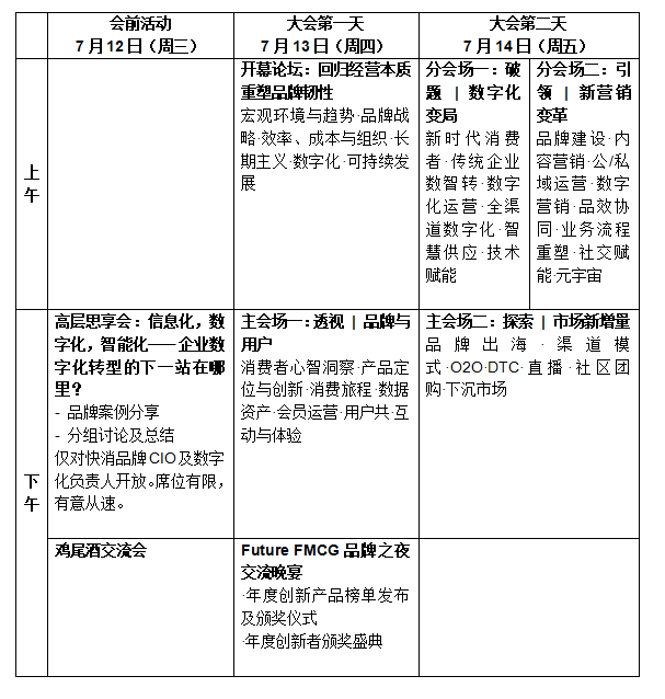 三天峰会涵盖5大主题论坛、1场高层思享会、5场圆桌对话、Future FMCG品牌之夜、年度创新者颁奖盛典、年度创新产品TOP榜单发布&特展专区、品牌生长力特展、先锋科技路演等多项活动,以期为快消企业创造多样化且有价值的学习平台与社交场合。
