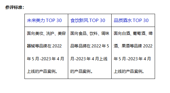 Future FMCG年度创新产品榜单分为未来美力TOP 30、食饮新风TOP 30以及品质酒水TOP 30等三个子榜单,参评标准如下。