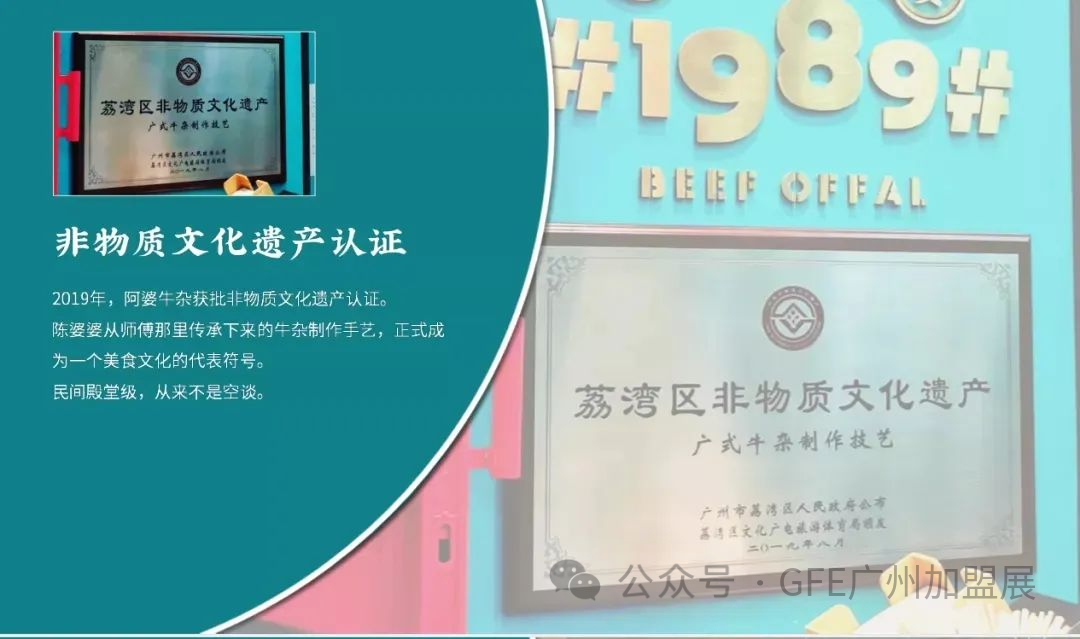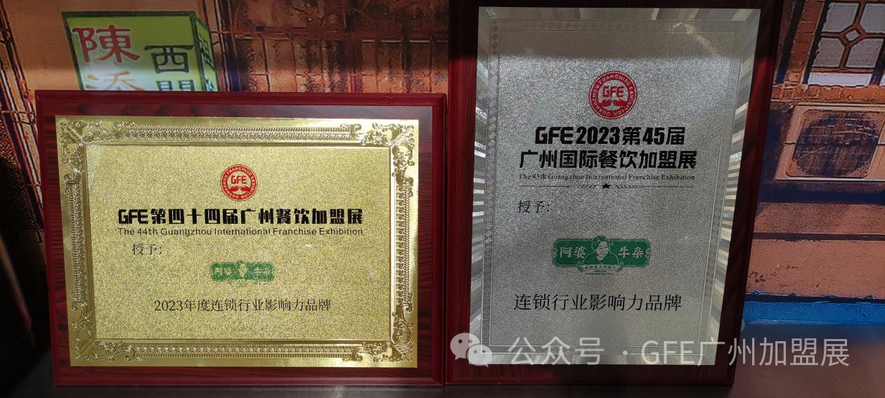 阿婆牛杂在2023年4月第四十四届广州国际餐饮加盟展和2023年9月第四十五届广州国际餐饮加盟展中都赢得了“连锁行业影响力品牌”荣誉。