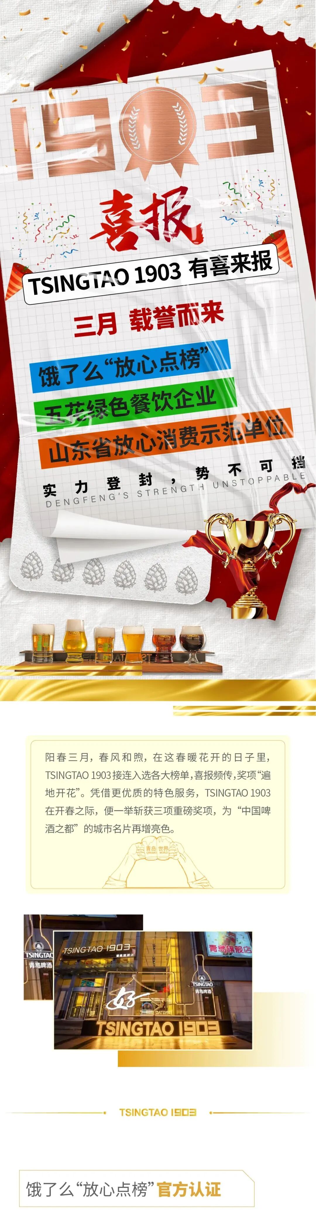 青岛市连锁经营协会发布,长期以来,TSINGTAO 1903 品牌树立绿色、健康、环保、低碳、安全的发展理念,通过成立“创建绿色饭店”领导小组、坚决推动“创绿”硬件项目落实到位;全面提高服务质量等措施积极践行绿色饭店标准。