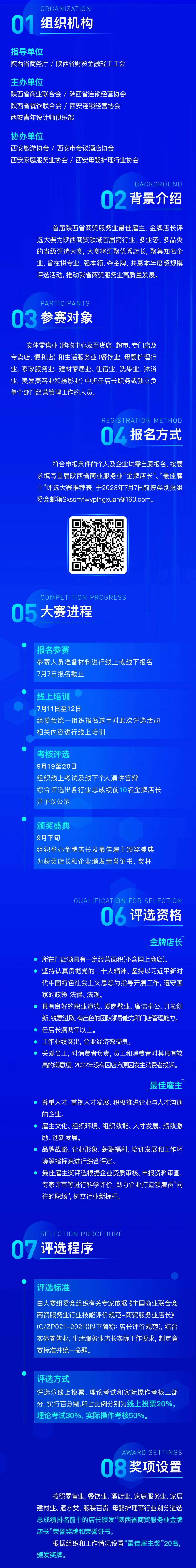 由陕西省商务厅和陕西省财贸金融轻工工会指导,陕西省商业联合会、陕西省连锁经营协会、陕西省餐饮联合会、西安青年设计师俱乐部联合主办的《首届陕西省商贸服务业“最佳雇主”、“金牌店长”评选大赛》将于2023年7月-9月进行报名、培训、考评及颁奖。