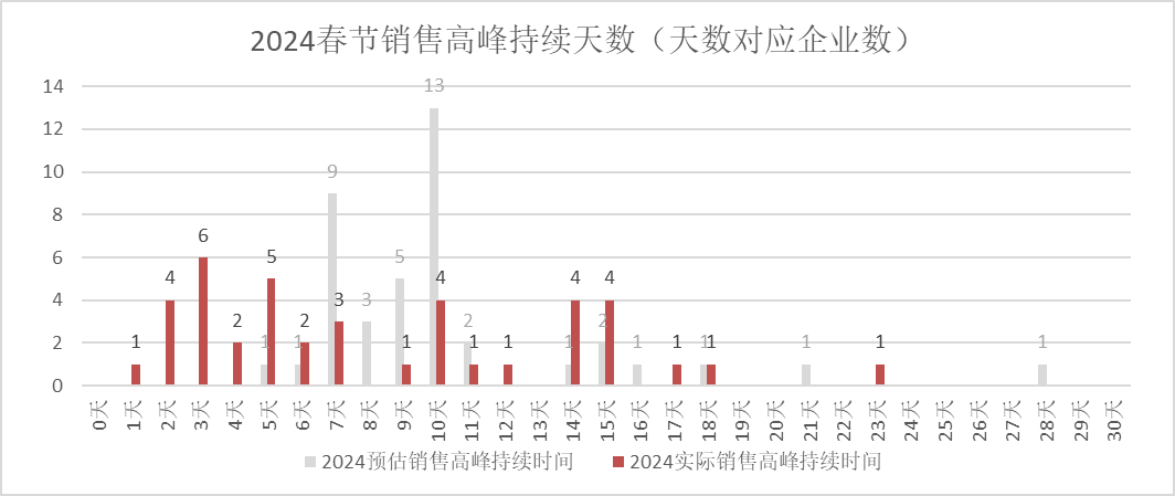 2、因除夕当日不放假,销售高峰期的持续时间对比往年有所变短(大部分为7天及以内)。