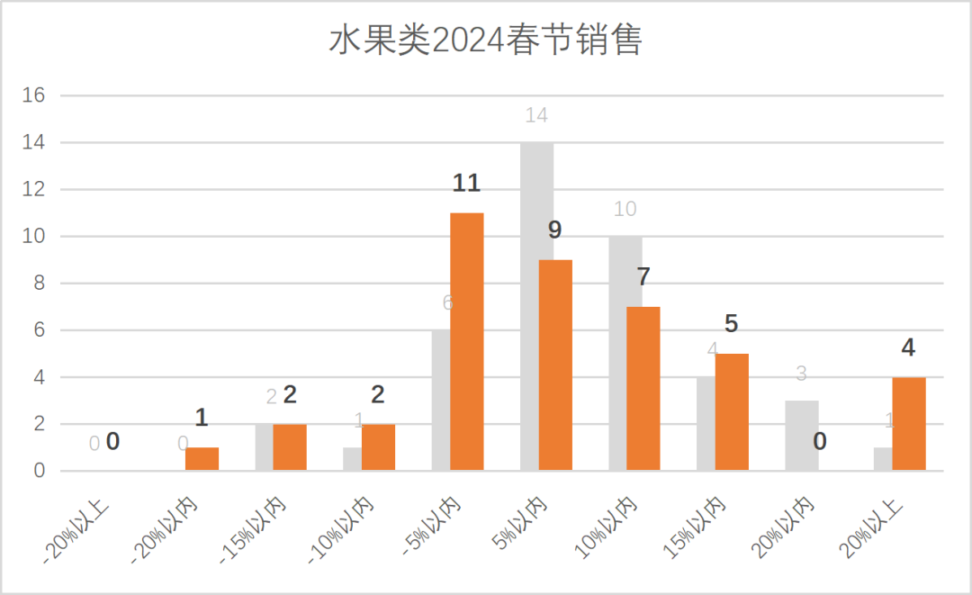 水果销售好于预期。随着市场供应量的增加,水果价格稳中有降,对消费者有一定的吸引力,特别是中低端礼盒销售普遍增长。