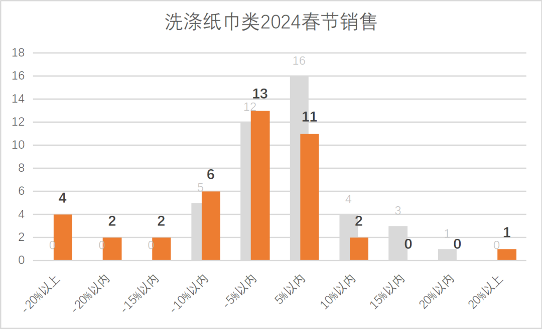 洗涤纸巾类商品日常备货较充足,节日属性不明显,且缺少活动,导致销售低于预期。
