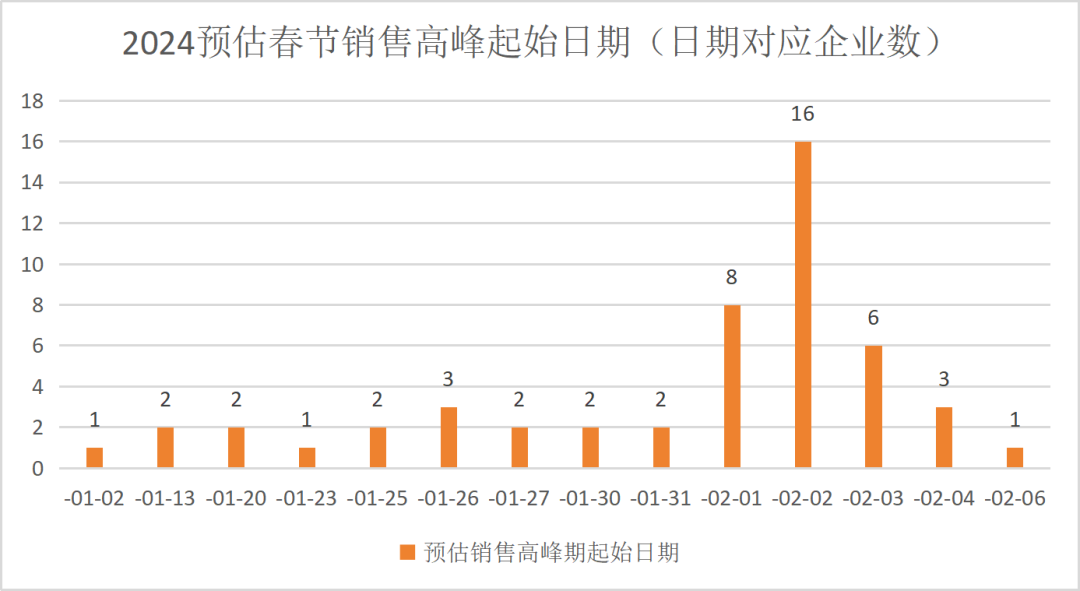 今年除夕日为工作日,大部分地区预估从2月1日-3日开始进入销售高峰。