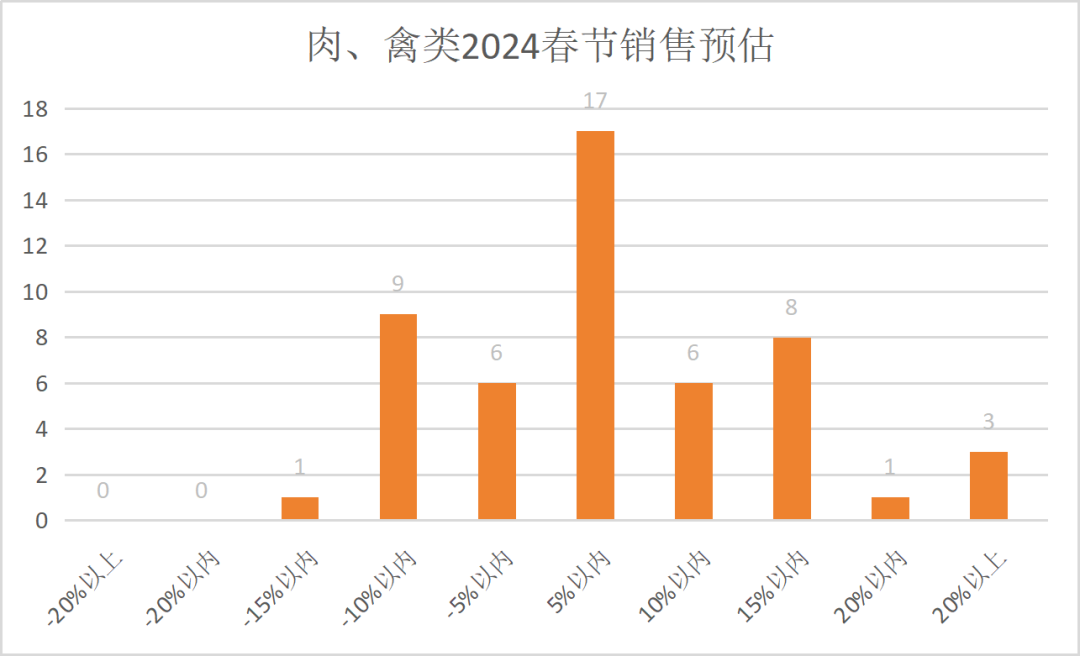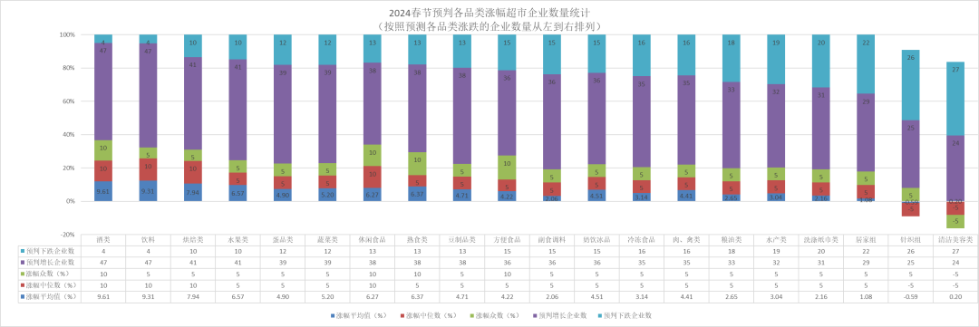 新春佳节即将来临,中国连锁经营协会采购专业委员会开展了2024年春期间各商品品类的销售预测调查。51家商超企业参与了调查,通过对比
