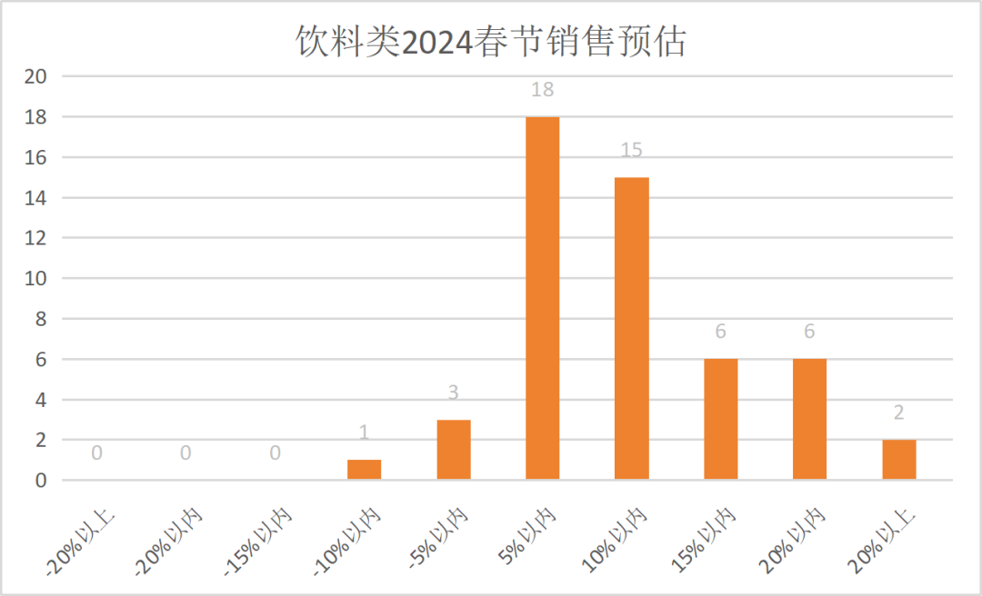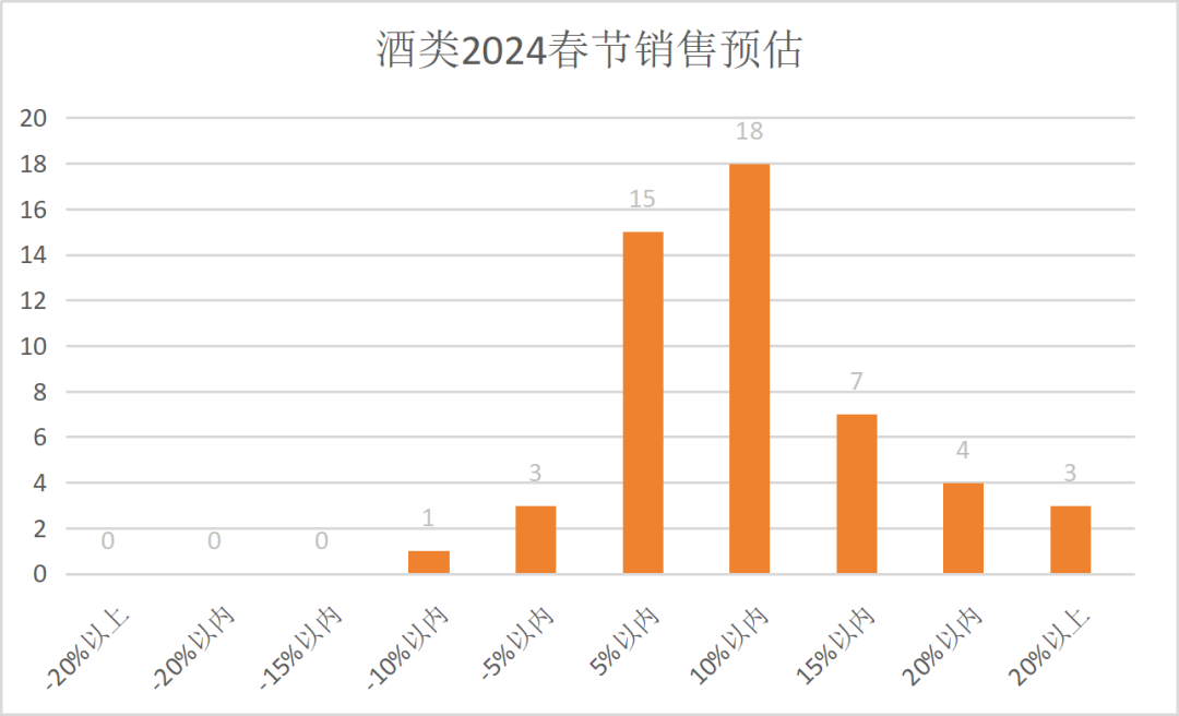 调查显示:有47家企业预测销售上涨(占比92%),4家企业预测销售下跌(占比8%),预估销售的中位数与众数都为增长10%,平均值为增长9.61%。酒水节日属性较强,春节期间聚餐、走亲访友必不可少,大部分企业预测5%-15%的增长幅度,明显好于往年。