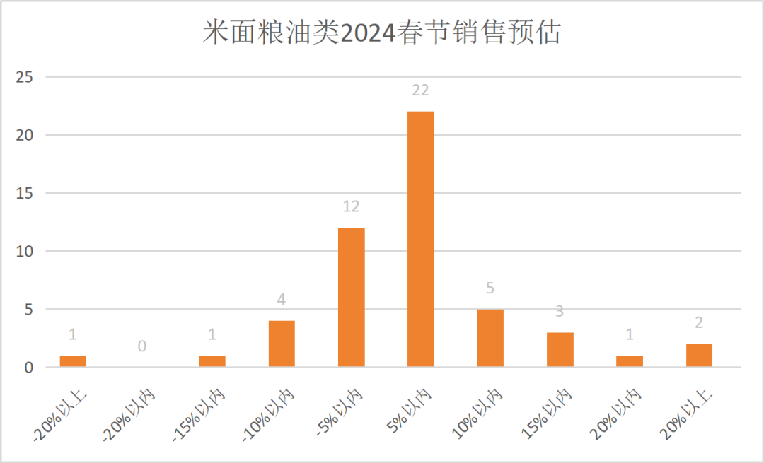 调查显示:有33家企业预测销售上涨(占比65%),18家企业预测销售下跌(占比35%),预估销售的中位数与众数都为增长5%,平均值为2.65%。预测情况来看,多数企业预期销售增长幅度较稳定。烹饪油有礼品属性,节日送礼可能促进增长。大部分企事业单位团购都以粮油类商品类为主,已经在节前释放了销售,因此假期内不会有大的销售提高。
