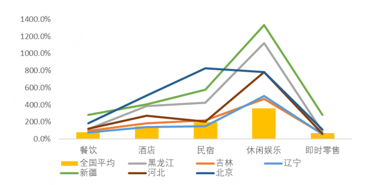 旅游业是具有较强综合带动作用的行业,冰雪旅游休闲虽然以“冰雪风光、冰雪运动”等作为核心吸引物,但其近年来的快速发展离不开旅游目的地的餐饮、住宿、娱乐、休闲、购物等多种消费业态的跨场景融合,大部分游客既希望能获得不同于惯常环境的新奇性体验,又想要享受到与自己日常生活习惯相适应的优质服务。体现在冰雪旅游过程中,平日难得一见的冰雪风光是出游的重要动力,但吃地道的地方菜,逛本地人常逛的街区,光顾特色打卡地,体验地方民俗文化,享受惬意娱乐休闲,购买旅行纪念品等多种活动都成为旅游的“标配”。纵观近期冰雪旅游发展,可以发现热门的旅游目的地无一不把多业态融合作为增加城市吸引力、提升游客满意度的重要抓手,多地开展丰富多样的主题线路、特色街区、节庆庙会、餐饮盛宴、体育赛事、亲子娱乐等冰雪休闲旅游活动。在冰雪旅游过程中,生活服务平台也综合了“食住行游购娱”等多种要素,给异地游客提供了多种多样的便利化消费选项。“查点评、做决策”以寻找必吃餐厅,“先预订、再消费”以提前确定滑雪+住宿行程,“线上购买、线下体验”在游山玩水之余感受东北洗浴文化,“人在宾馆、送货上门”足不出户购买雪具、保暖用品等成为许多游客的新选择,也让冰雪旅游消费体验不断提升。美团数据显示,2023年下半年冰雪季,全国异地游客在餐饮、酒店、民宿、休闲娱乐、即时零售等业态上的消费规模分别同比增长了76.4%、146.8% 、196.5%、356.6%和65.7%,而黑龙江、吉林、辽宁、新疆、河北、北京等热门的冰雪旅游目的地以上几类业态消费规模的同比增速基本均高于全国水平,其中新疆维吾尔自治区这几类业态的平均增速超过570%,黑龙江平均增速超过420%(见图4),可见业态多样性和消费融合度对当地旅游发展的重要性。