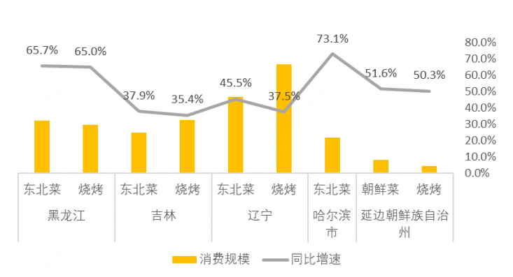 近年来,地方菜作为“城市名片”,对当地经济和文旅发展的带动促进作用愈发显现,也获得各地政府的高度关注。特色餐饮成为越来越多游客希望体验的“必选项”。以东北地区为例,美团数据显示,2023年下半年冰雪季,黑龙江、吉林、辽宁三省的东北地方菜和东北烧烤两大类菜系的消费规模均实现了较大幅度的同比增长。就具体城市来看,哈尔滨市的东北菜同比增幅高达73.1%,延边的朝鲜族特色餐饮和延边风味烧烤也受到越来越多游客的欢迎,同比增幅分别达到51.6%和50.3%(见图5)。除此之外,新疆菜、河北菜、内蒙菜等地方特色餐饮也为新疆、河北、内蒙三地的冰雪旅游消费贡献较大增长份额,“冰雪+餐饮”正体现出业态融合之后的强大增长动力。![]()