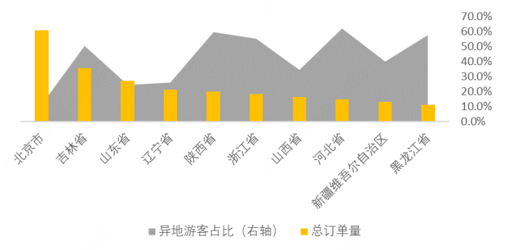 图8 2023下半年冰雪季大众冰雪旅游休闲项目TOP10省份消费总量及异地游客占比情况