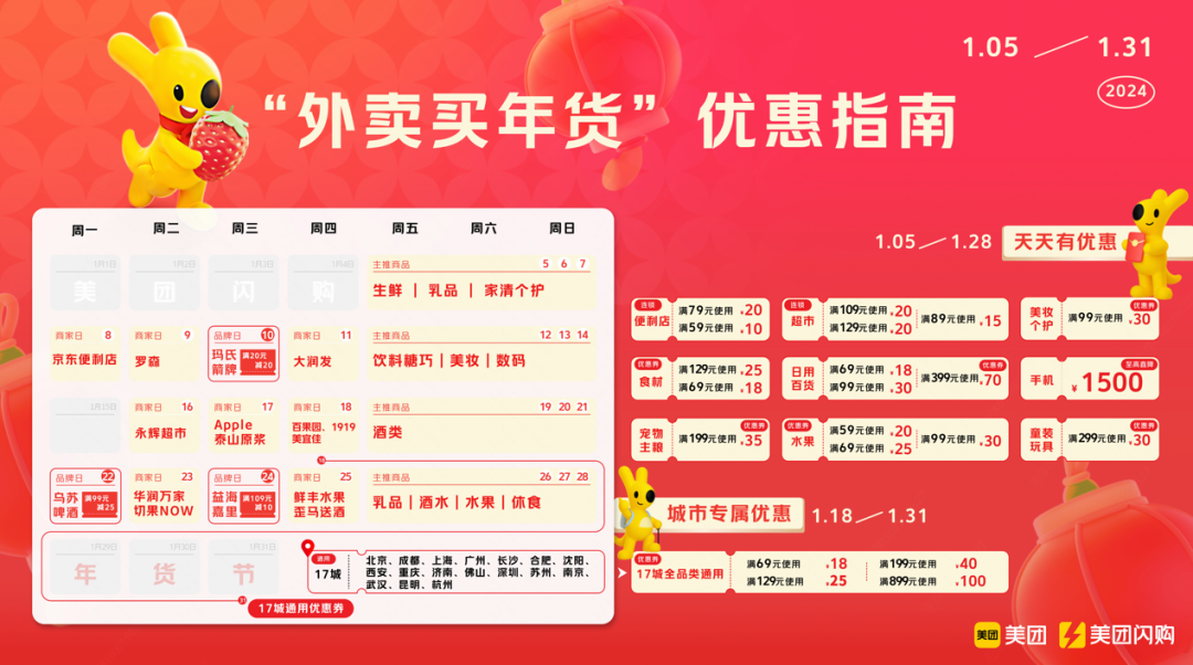 去年年货节期间,“像点外卖一样买年货”的消费表现已经凸显,今年1月5日,美团闪购也宣布正式启动2024年“年货节”,并持续至元宵后(2月25日),更好地发挥“外卖买万物”优势。