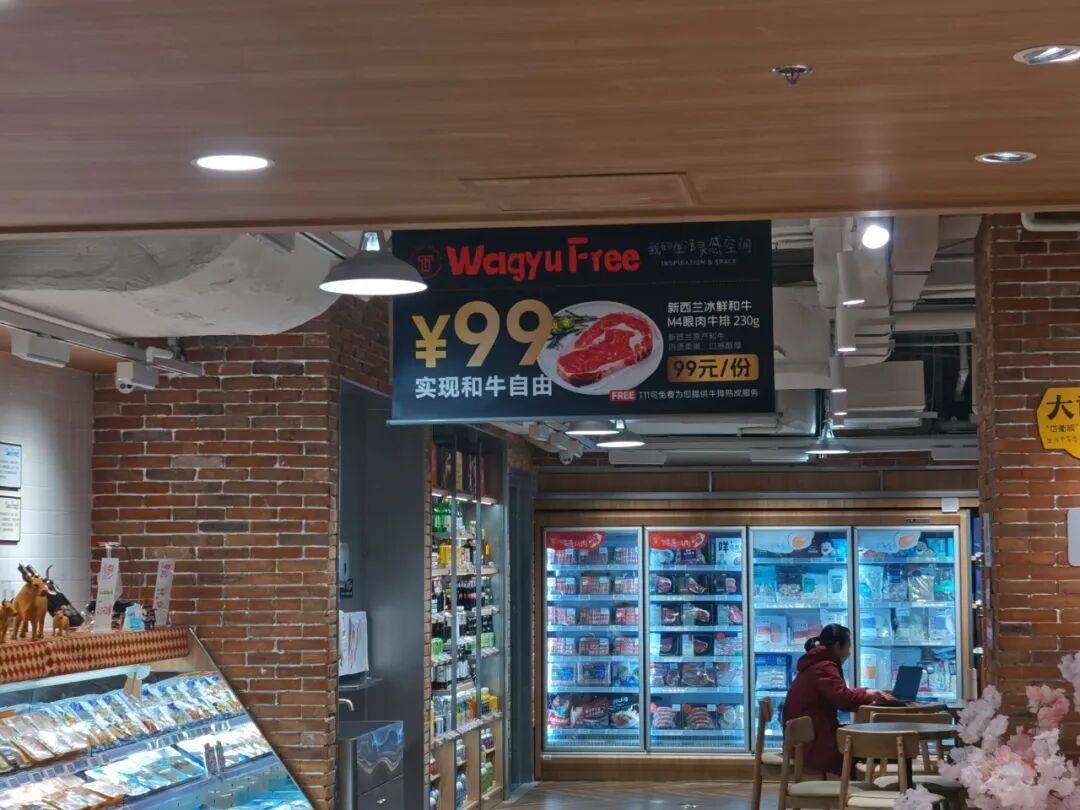 比如现场烹饪部分,1733店的牛排性价比很高,店内宣传语是“实现和牛自由”,在餐饮区单点一份牛排只要99元。但很明显,店内餐饮肯定不是单点的概念,抖音同学通常会搭配一瓶精酿啤酒或一杯红酒,这样客单就很容易突破一百。