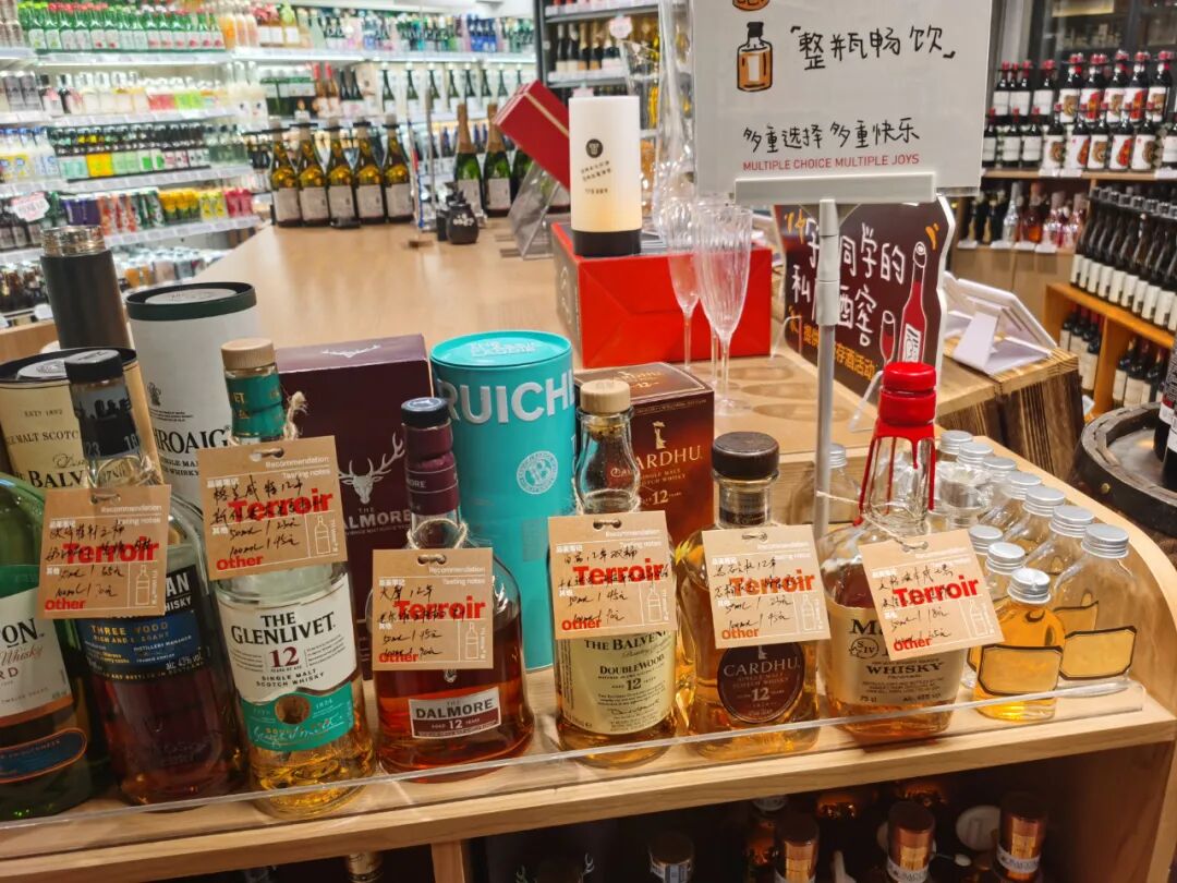 在这个店,50块钱可以喝到格兰菲迪(苏格兰威士忌),因为瓶装洋酒可以散卖,50ml、100ml都可以,现场提供精致便利的mini随手瓶,让年轻消费者尝试喝洋酒,且方便带走。