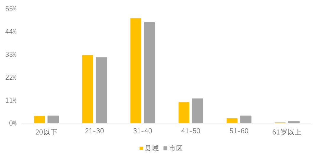 随着互联网基础设施的下沉,县域居民的网络消费习惯逐渐形成,县域生活服务线上消费也呈现出相对稳定的增长。国家统计局数据显示,2018-2022年农村网络零售额逐年增加,2022年农村网络零售额占农村消费品零售额的比重为37%(见图2),创历史新高。在线上实物商品消费的带动下,县域居民的网络消费对象也开始从实物商品向服务商品蔓延。从订单层面看,美团数据显示,2019-2023年前三季度县域生活服务消费订单占全国的比重持续增加,从2019年的23.8%上升至2023年的30.6%,订单量五年复合增长率超40%,高于全国增速水平(见图3)。从消费者层面看,美团数据显示,2019-2023年前三季度县域地区平台上有交易的消费者数量五年的复合增长率为24.7%,高于全国21.2%的平均水平。20-40岁县域居民生活服务消费的核心客群,其中20-30岁用户占比32.9%,30-40岁用户占比50.5%,两个群体的占比均高于市区(见图4)。
