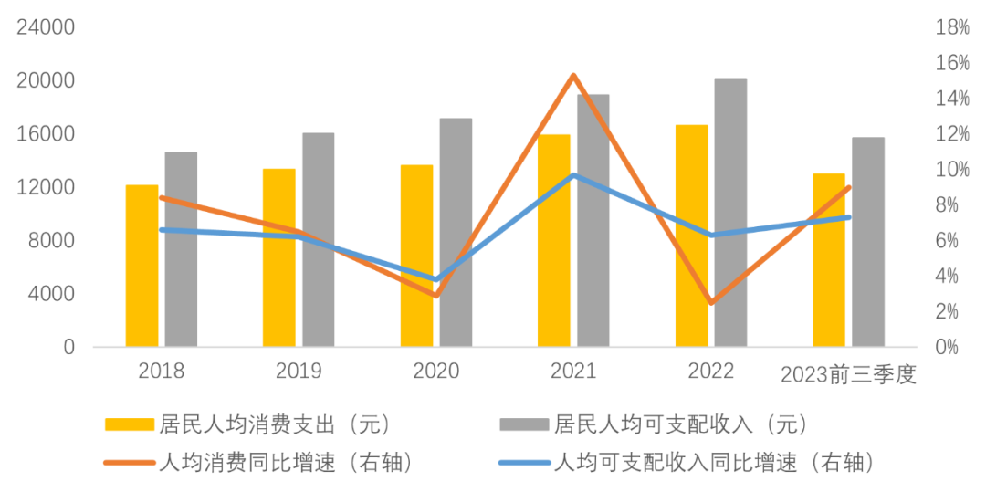 图1 2018-2023年农村居民人均可支配收入、人均消费支出及增速